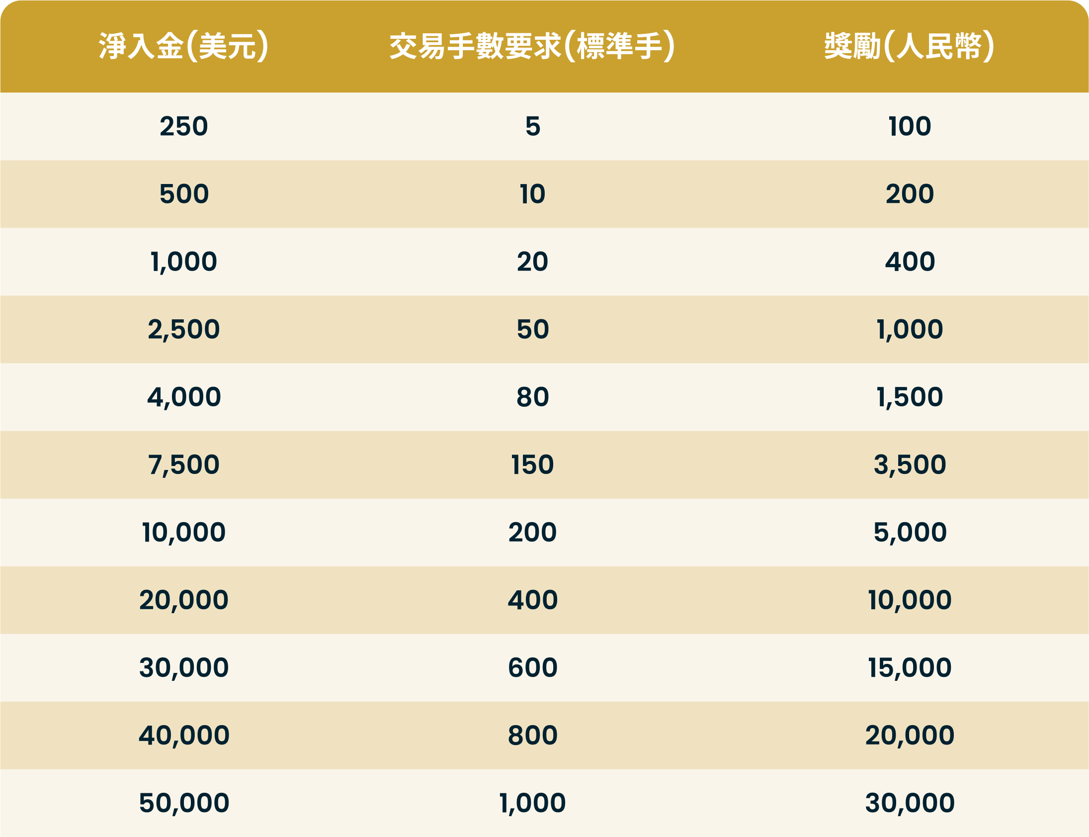 7. 客戶於活動期間內並沒有出入金的次數限制,但需滿足活動頁面內的淨入金及交易手數要求,方可符合對應等級的領獎資格。