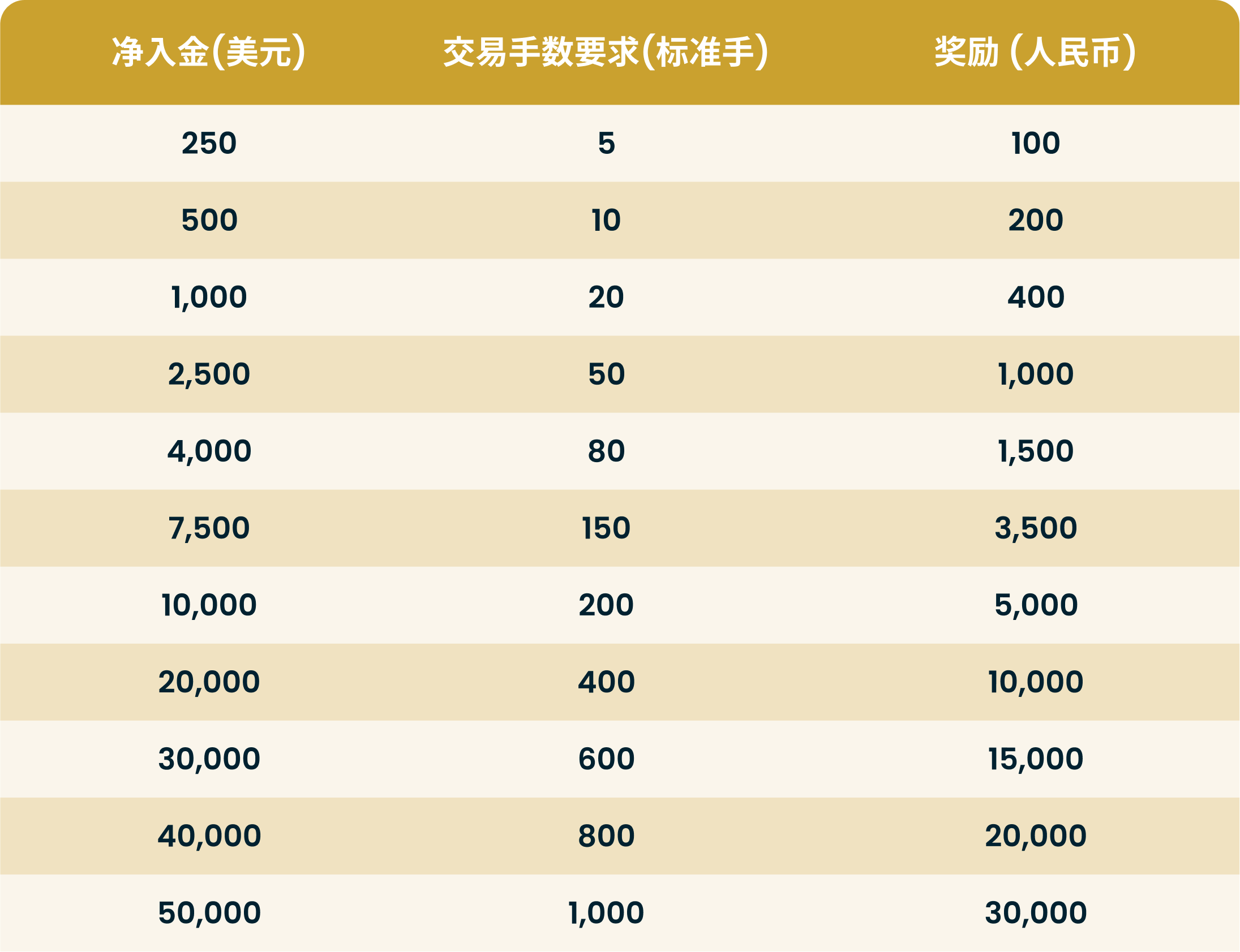 4. 净入金的定义为于活动期间内的总入金与总出金之差。但透过账户内的交易及转账所存入的金额并不包括在内。