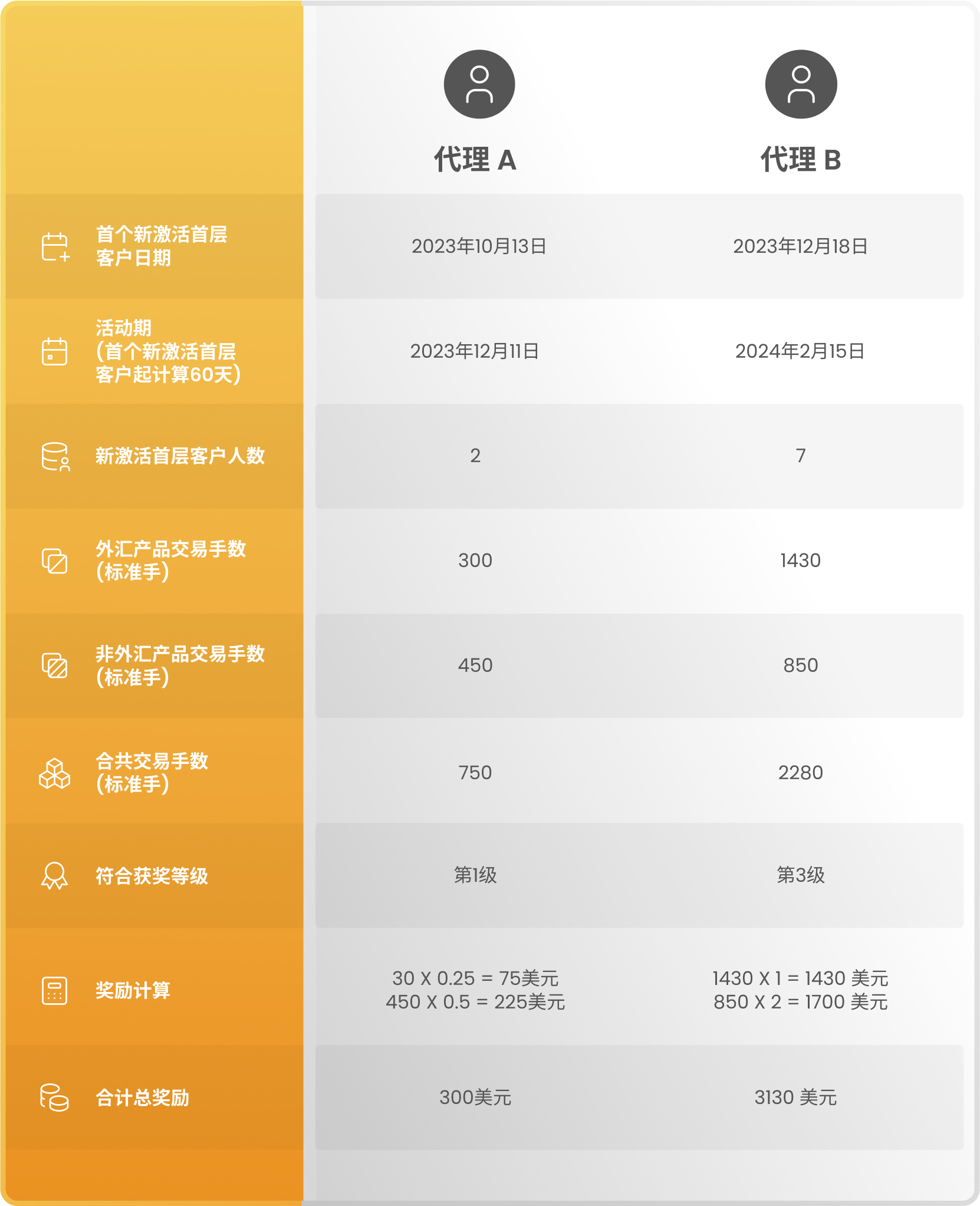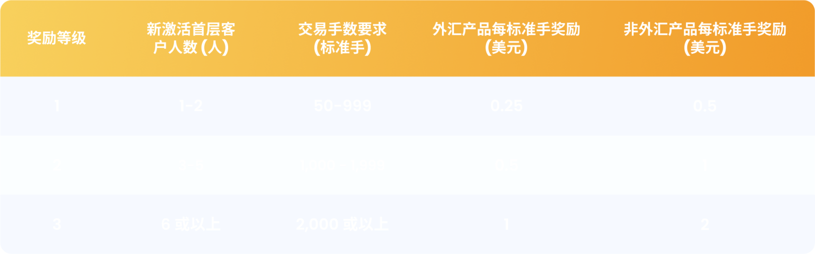 5. 代理商需于活动期间内(即2023年10月1日至2023年12月31日)新激活首个首层客户起计算60天内同时满足活动页面的新激活首层客户人数及交易手数要求,就可获得对应等级的返佣奖励。