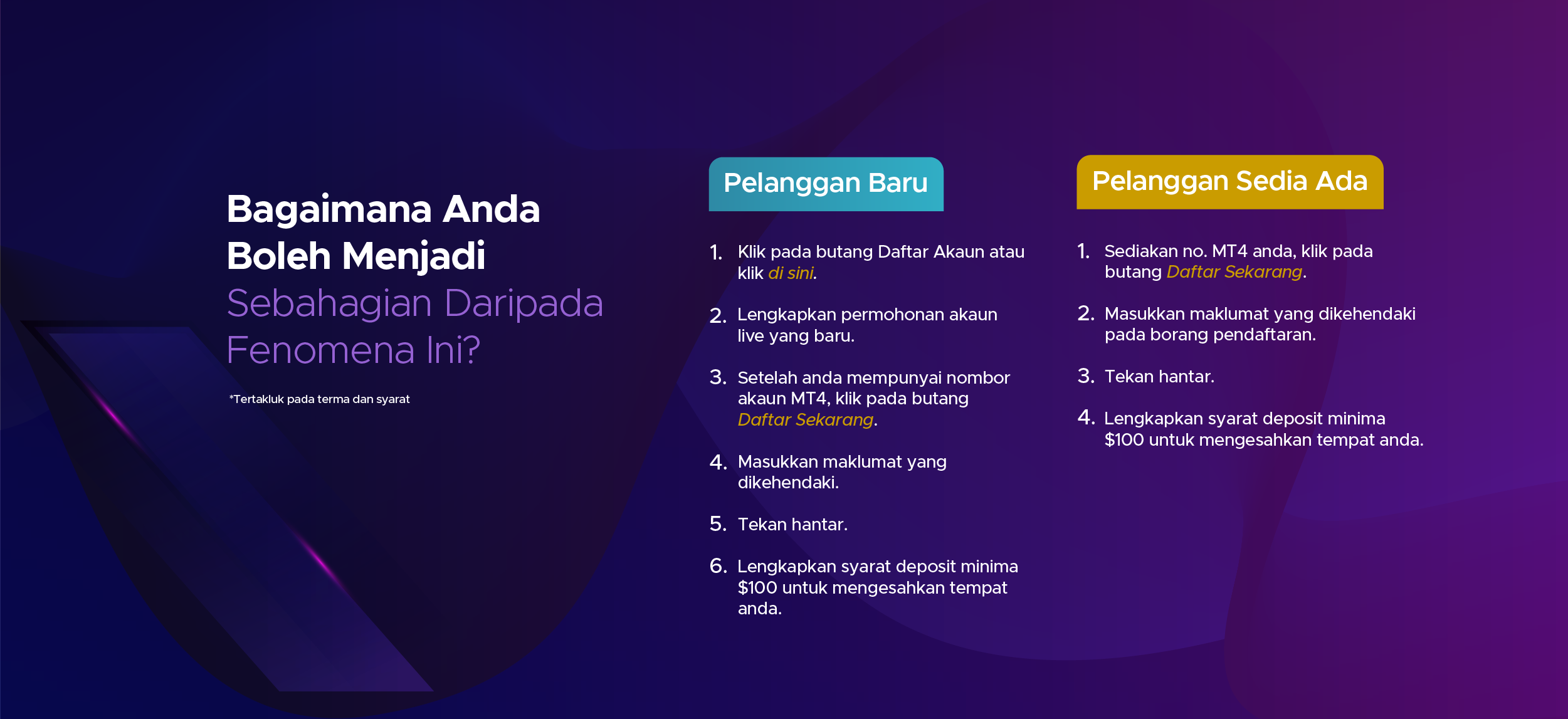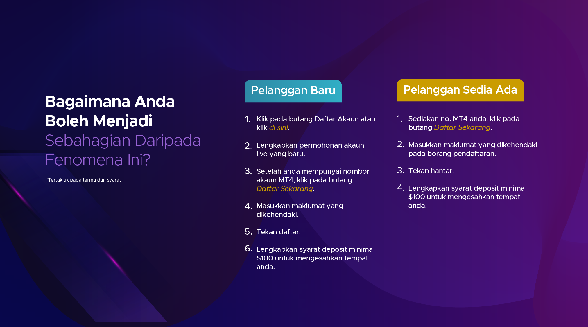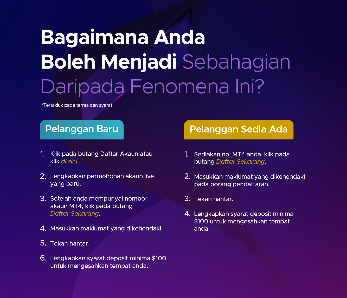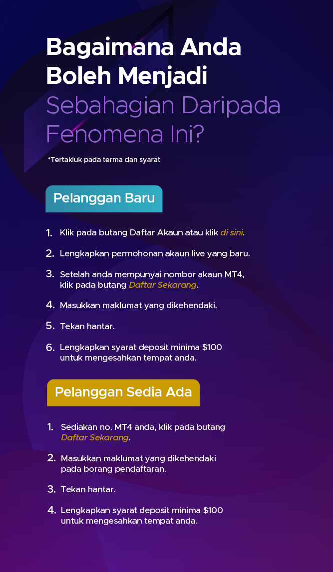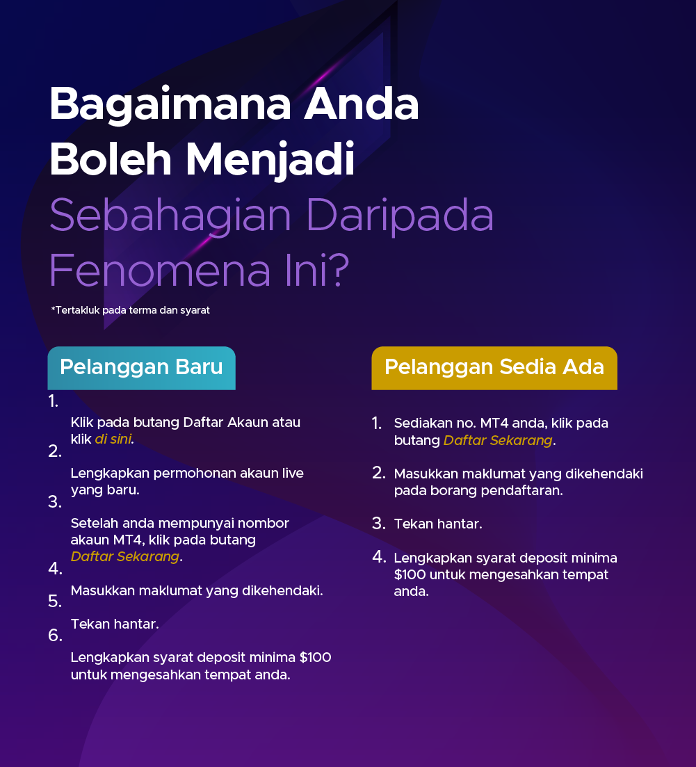 Kontrak untuk Perbezaan (CFD) adalah instrumen yang kompleks dan berisiko tinggi untuk kehilangan wang dengan cepat kerana leverage. Anda mungkin diminta untuk membuat deposit tambahan bagi memenuhi keperluan margin anda. Anda harus mempertimbangkan sama ada anda memahami bagaimana CFD berfungsi dan kemampuan anda untuk menanggung risikonya. Prestasi kewangan masa lalu bagi instrumen yang mendasari bukanlah jaminan atau indikator prestasi masa depan. Berdagang derivatif kewangan mungkin tidak sesuai untuk semua pelabur. Pastikan anda memahami sepenuhnya risiko yang terlibat, dan jika perlu dapatkan nasihat bebas.