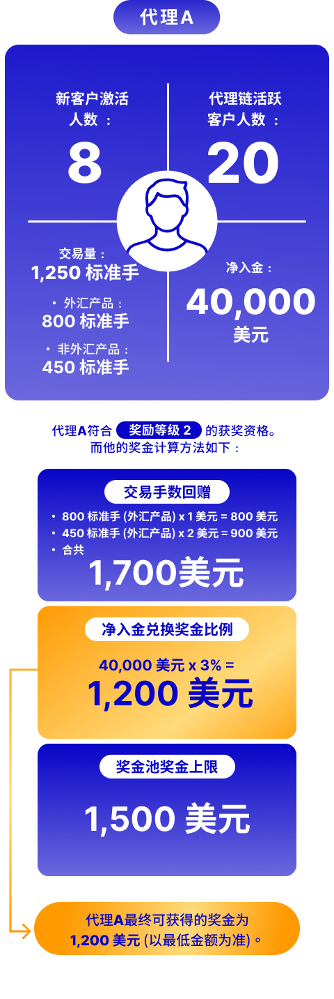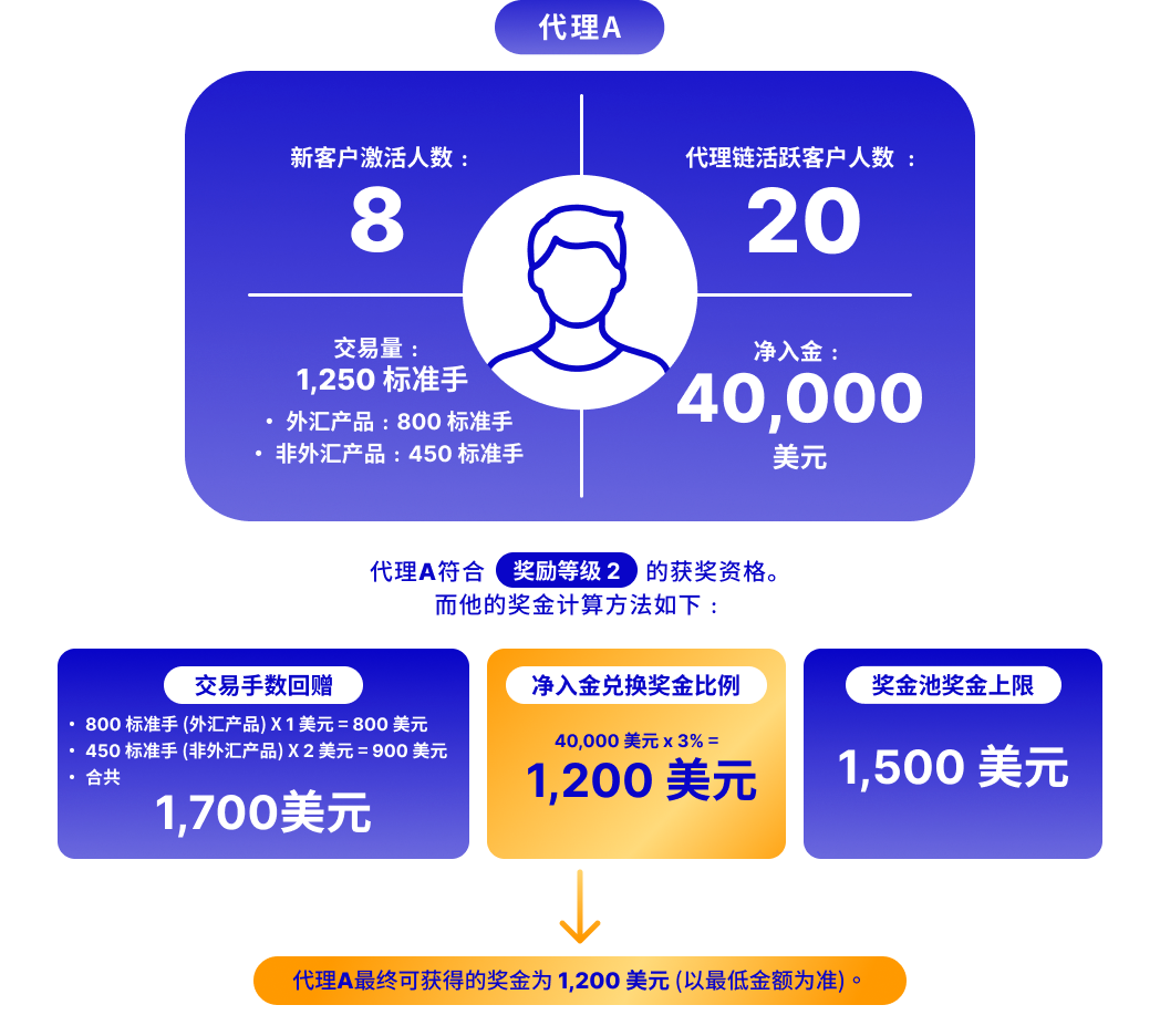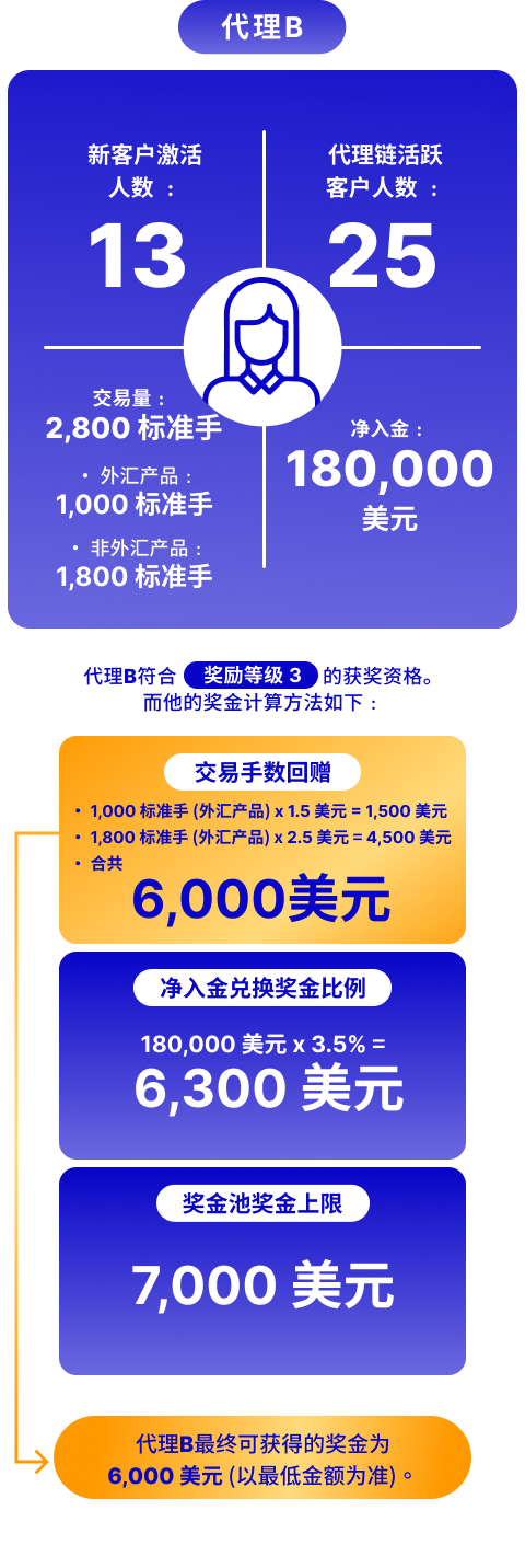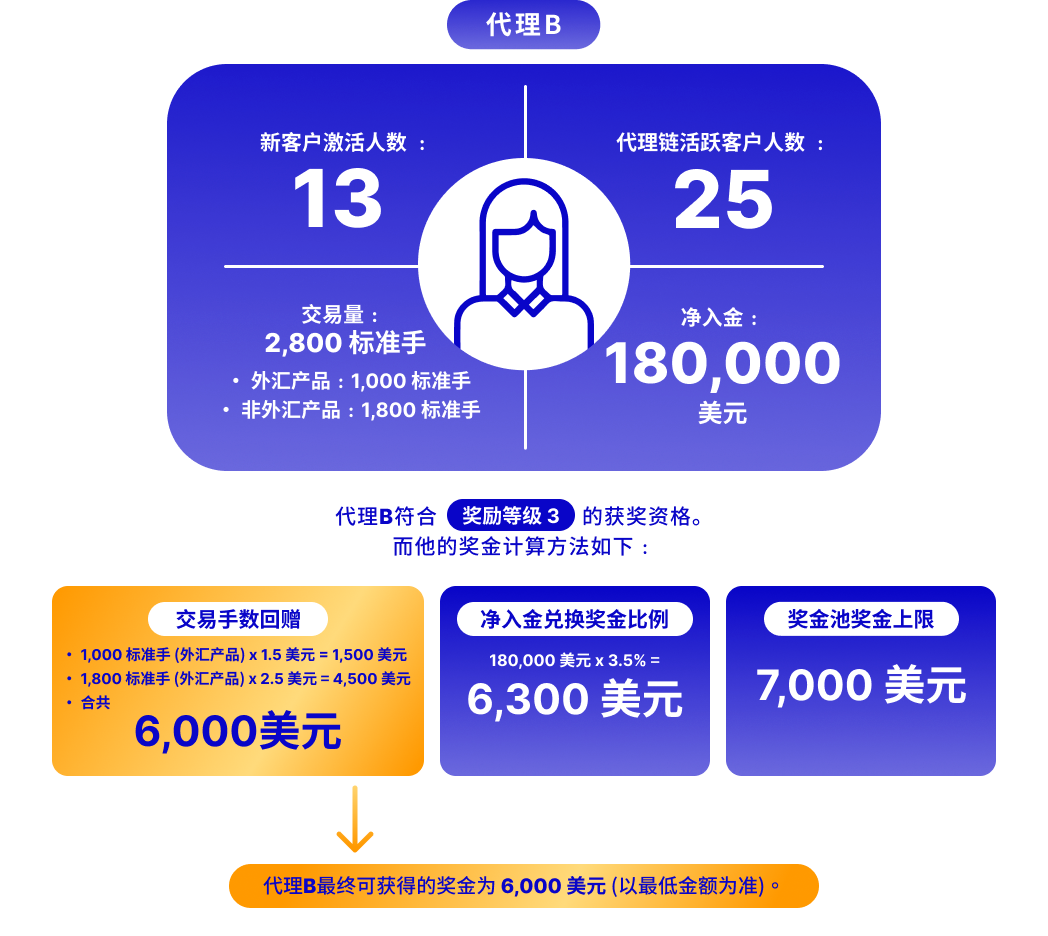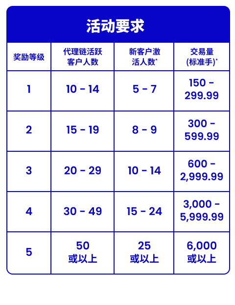 4. IB需于本推广活动期内同时满足所要求的代理链活跃客户人数、新客户激活人数以及交易量(标准手)条件,方可符合获奖资格。