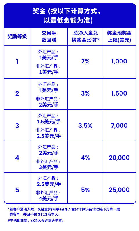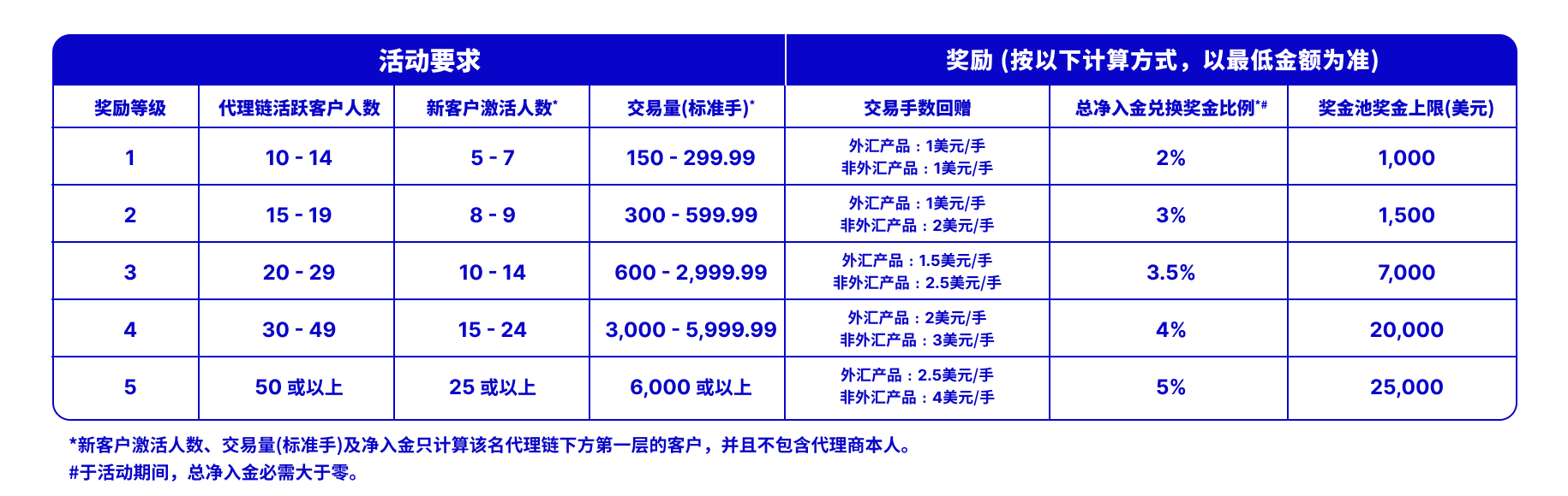 6. 新客户激活的定义为直属于其IB链下的首层直接客户或首层子代理,并于推广活动期内入金500美元或以上及交易至少1标准手。