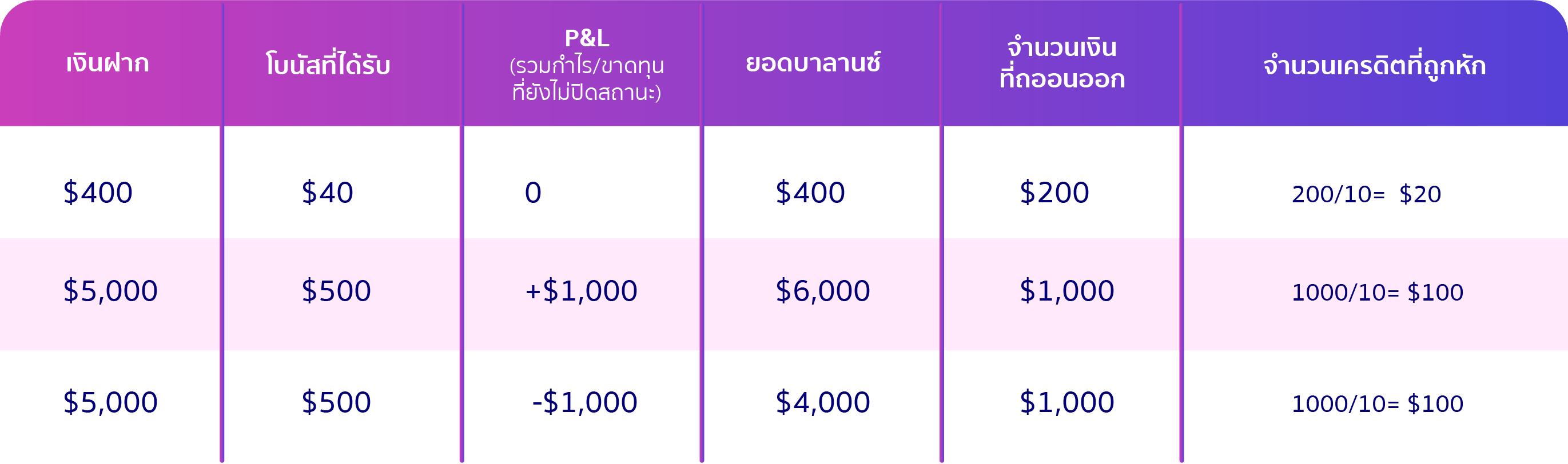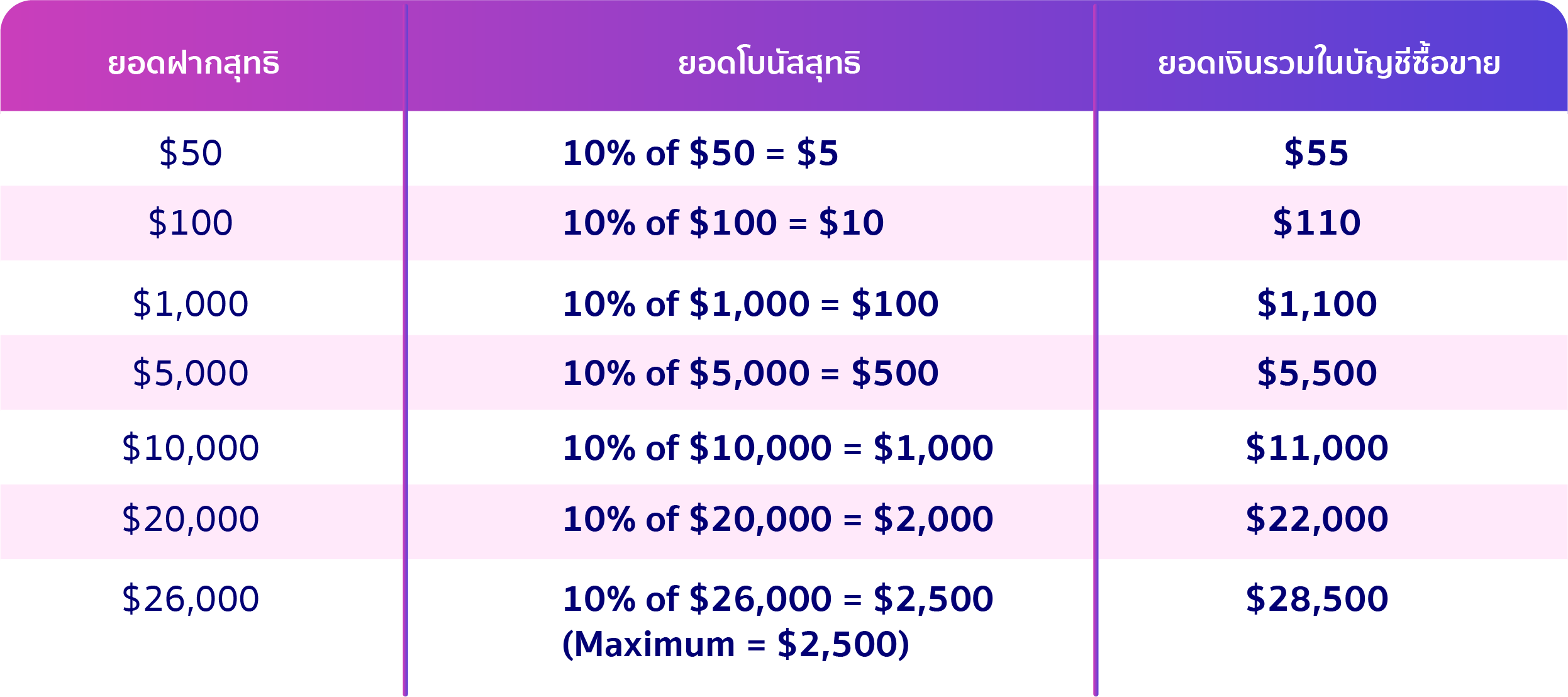 1. ลูกค้าทุกคนที่เข้าร่วมโปรโมชันเทรดครบแลกรับของรางวัล (Wishlist) มีสิทธิ์รับโปรโมชันเครดิตโบนัส 10% โดยลูกค้าสามารถรับเครดิตโบนัส 10% ของจำนวนเงินฝาก การคิดคำนวณ: เครดิตโบนัส = ยอดฝากสุทธิ * 10% (ตามเงื่อนไขโปรโมชันเครดิตโบนัสที่กำหนด) ตัวอย่างตามตารางด้านล่าง