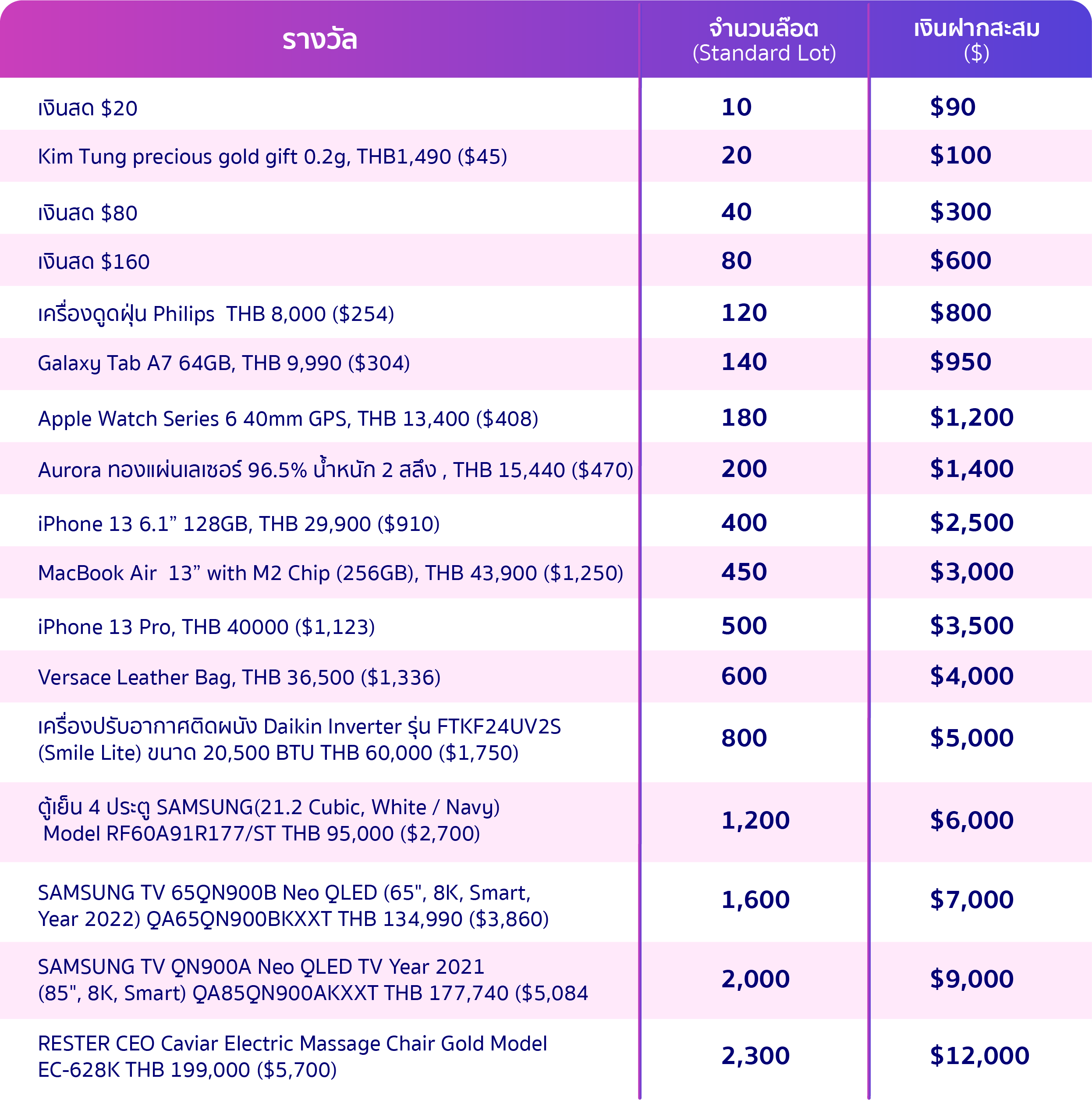 3.ลูกค้ามีสิทธิ์ได้รับโบนัสเงินฝากสะสมสูงสุดตลอดระยะเวลาโปรโมชันที่ 2,500 USD เท่านั้น แม้จะมีการแลกรับของรางวัลจากโปรโมชันเทรดแลกของ (Wish list) ไปแล้ว แต่ยอดโบนัสเงินฝากจะไม่เริ่มนับใหม่ แต่ยังสามารถรับเพิ่มได้หากยังไม่ครบ 2,500 USD